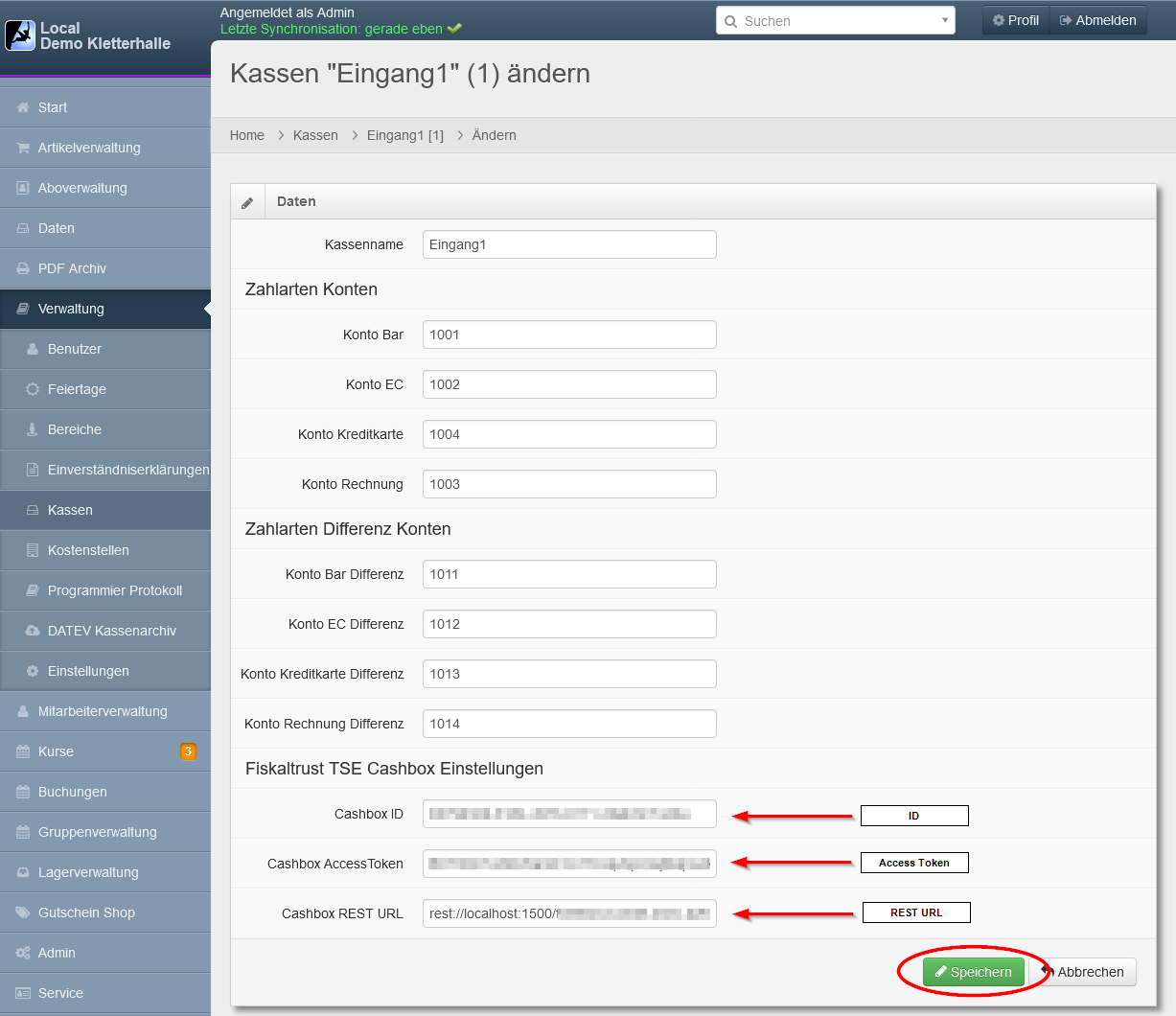Achte bitte darauf, dass du die richtige "Cashbox ID", "Cashbox AccessToken" und "Cashbox REST URL" der jeweils passenden Kasse zuordnest.