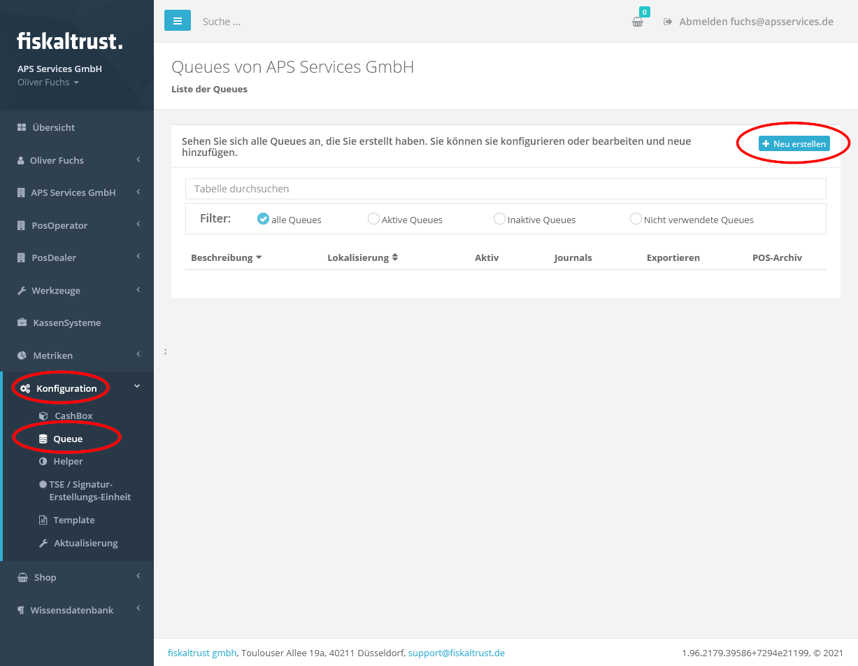 Klicke den Button „Neu erstellen“ an und lege jeweils eine Queue pro Kasse an.