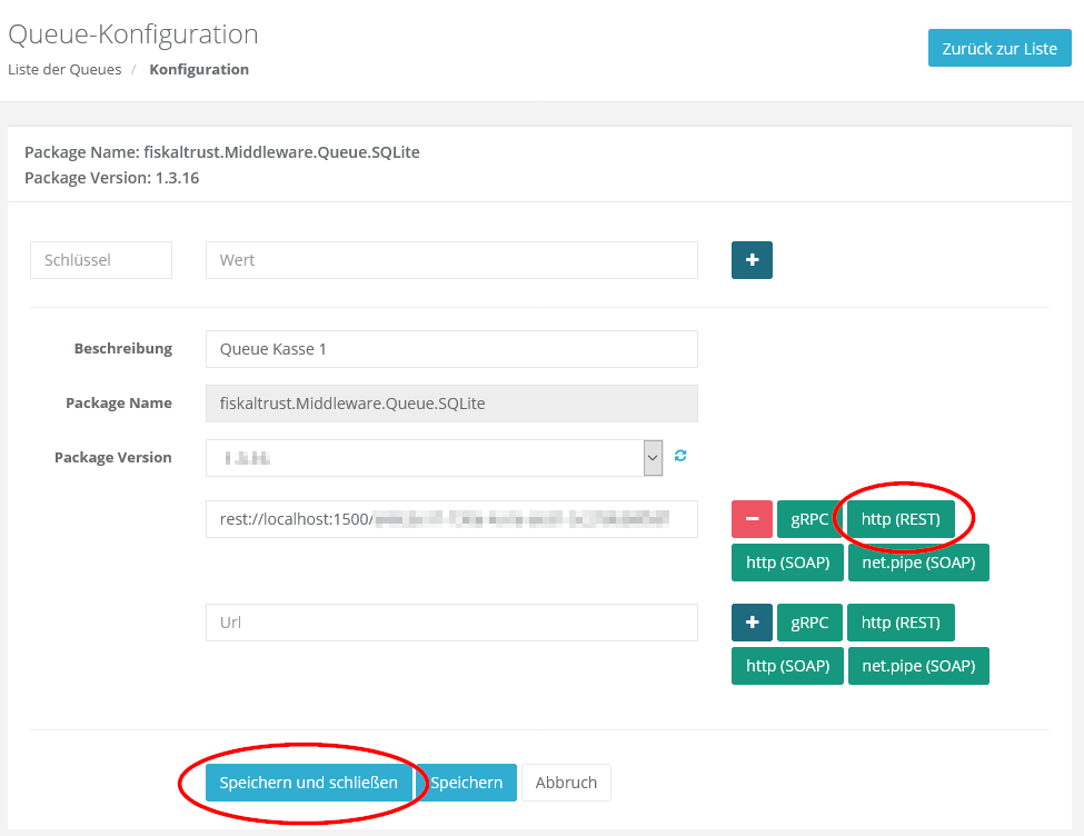 Klicke den Button „http (REST)“ an. Somit wird eine URL für die TSE-Einheit angelegt: