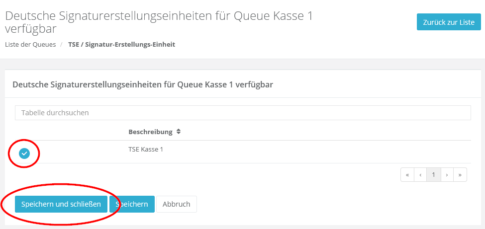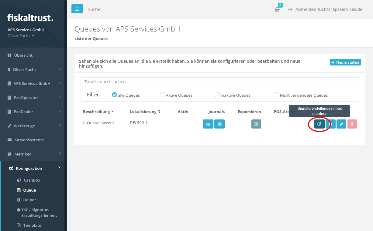 In der Queue-Übersicht „Signaturerstellungseinheit zuordnen“ für die angelegte Queue aufrufen.